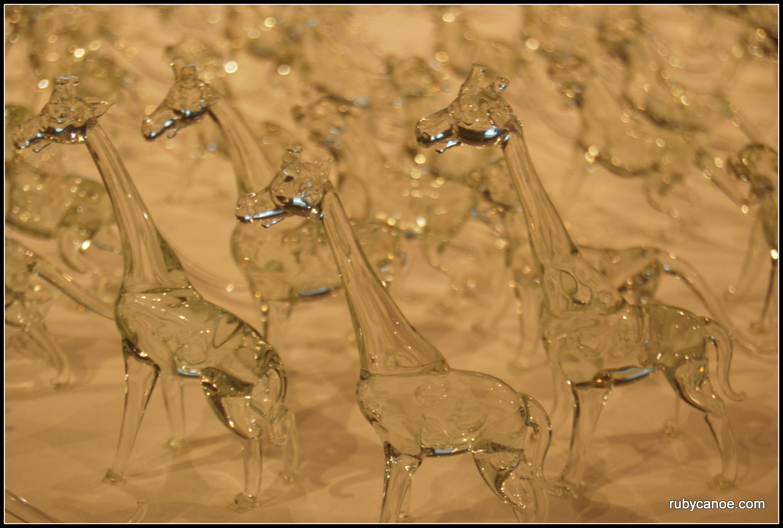 Piece by Tiffany Chung. This white “table” consists of, what seems like, thousands of little glass animals. When you walk into the room from the other darkened rooms, it is such a great feeling. The light that is reflecting off the glass fills the room. Just spectacular.