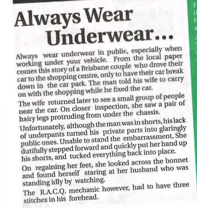 Now, this is a great life lesson people. Always wear undies, and you get bonus points for clean ones. I really can’t confirm if this is a true story but is bloody hilarious. I must say, what a lovely, caring wife she was…was…I don’t think, even if her husbands bits have neon arrows and a name tag, she’ll be tucking them back in next time. Lets hope for everyones sake that there isn’t a next time.