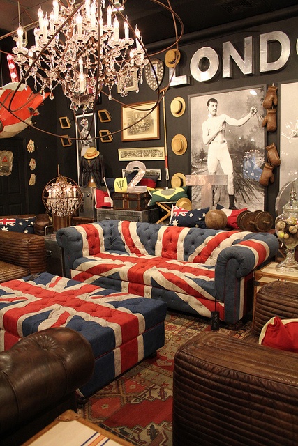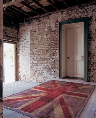 I just love the Union Jack, partly because it appears on our flag as well, and partly because of the strong colours. I always go for the antique, well worn Union Jack decorator pieces. And to have a rug with the Union Jack on it would be devine. One could only hope.