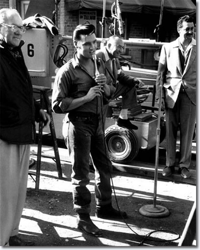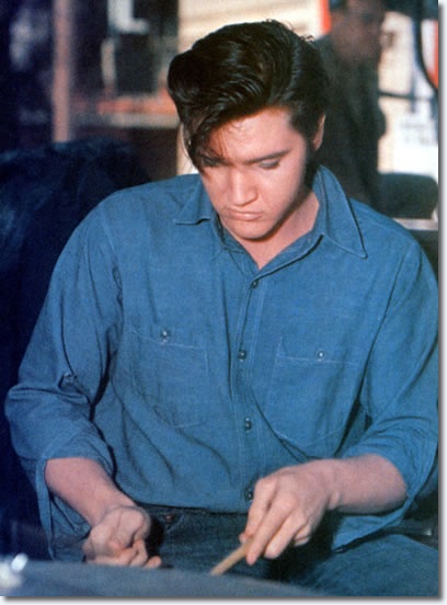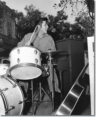 Elivs behind the scenes horsing around with DJ’s drums. The band and the Jordanaires were completely uncredited in this film.