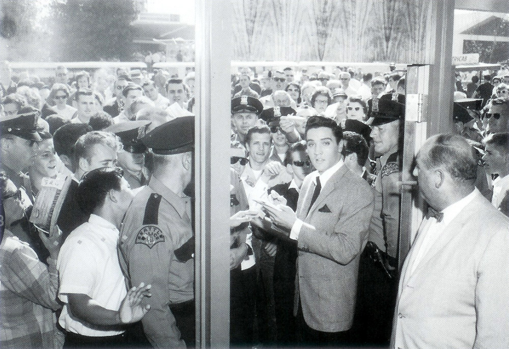 Mike and Danny are staying at Century 21 Estates (for 2 weeks), which looks like a mobile home caravan park. Elvis sings Broken Heart For Sale, with a heap of men from the Estates. Next scene at the Fair involves Kurt Russell and Diane feels so bad about not beleiving Mike was injured that she pedals him around the Fair on or in a three wheel bike…on a set, Alot of the patrons of the Fair look at the camera that filmed the scene live. Up to the restaurant at the Space Needle (I’ve been there!) and sing randomly at the dinner table, as you do…I’m Falling In Love Tonight.