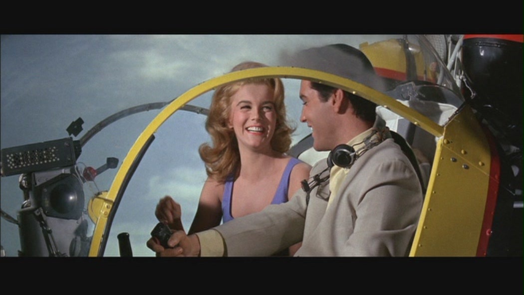 Rusty spends the day with Lucky and they start off with Elvis singing and Ann-Margret dancing, man the girl can wiggle, then they fall at the end, it’s really cute. They go shooting, riding motor bikes (which they both know how to do quite well in real life), dueling in the old west, and helicoptering. Then they go fake waterskiing. Then they meet Rusty’s Dad (William Demerest). At this point Lucky mentions he was in the Armed Forces (Air Force this time) again. Today, Tomorrow and Forever, such a nice slow song. Then a few more songs back to back, very groovy songs too. They do look really cute in yellow. Very enthusiastic dancers in this number.