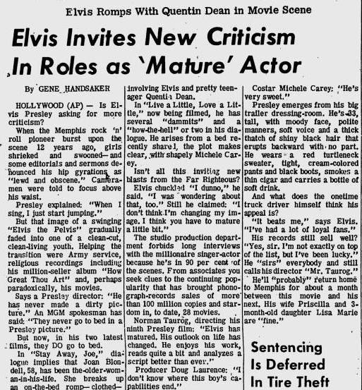Wow, a very different feel straight away. We are heading into the 70’s here. Elvis plays Greg Nolan, a newspaper photographer, and the first scene is Greg driving along the road and then the beach in his dune buggy. Hair all messed up, not something you see in many movies.