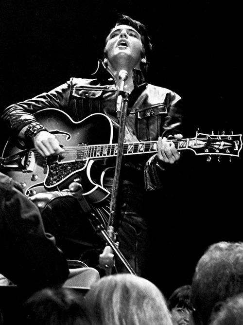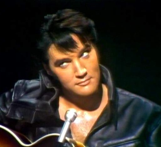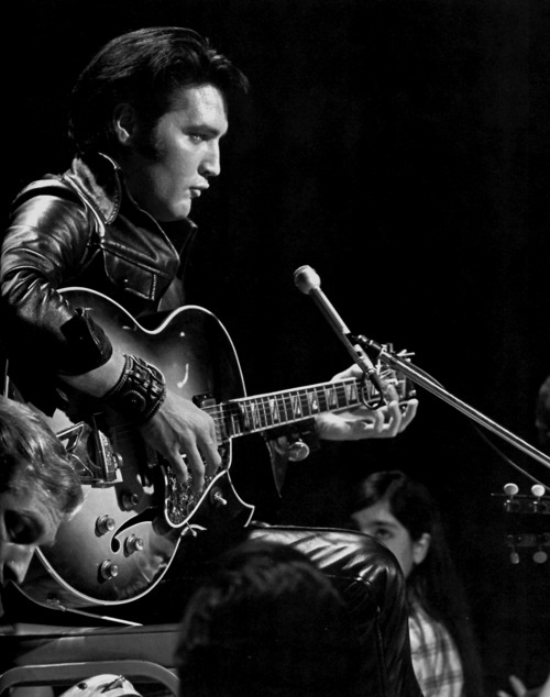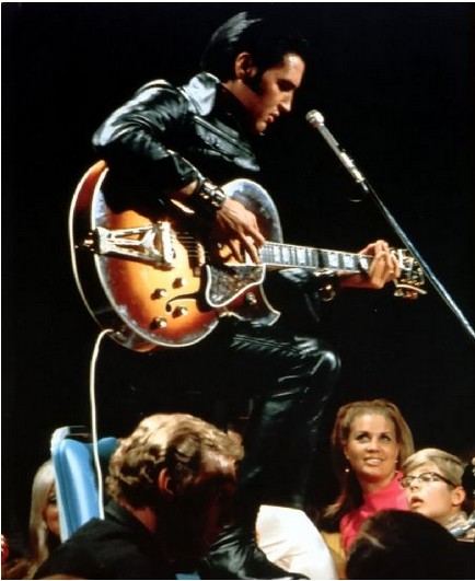 I think most people will agree, Elvis looks goooooooood. Elvis is sitting around with a few of his band members jamming, surrounded by audience members…girls…lots of screaming girls. First up Lawdy Miss Clawdy, just who is Tarnell (?) Elvis sits with the guys reminiscing about the old days and tells a few stories, nice to hear them from the horse’s mouth. Heartbreak Hotel is sung standing on the stage, and this is where we get a really good view of that outfit. Top to toe in black leather. This is the start of the high collar phase. He sounds awesome and looks, probably, better than he ever has.